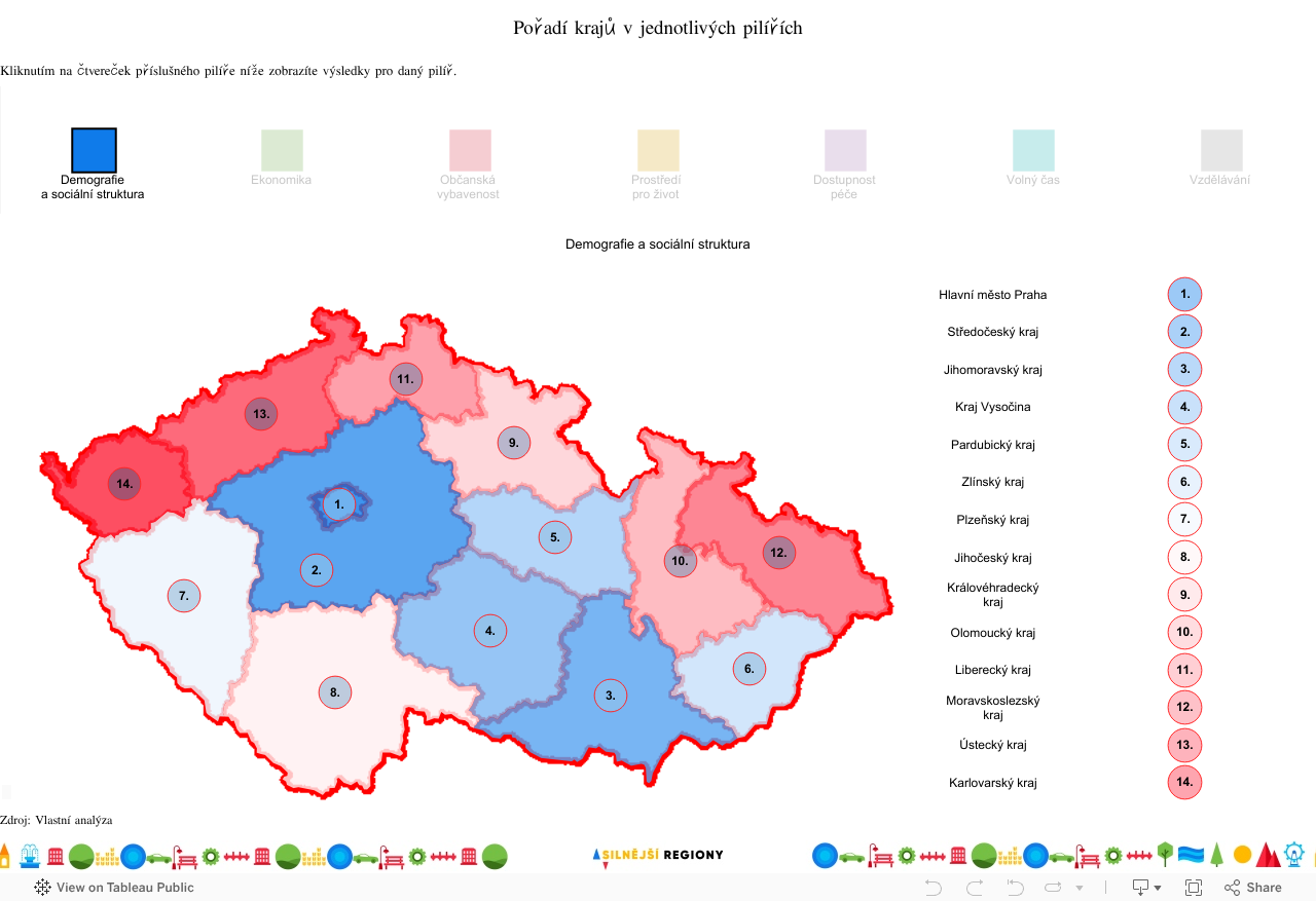 Plzeňský kraj ale není pouze o trávení volného času. Druhým nejúspěšnějším pilířem se pro kraj stala Demografie a sociální struktura, a to přesto, že v mezikrajském srovnání se řadí až na průměrnou 7. příčku v ČR. Fakt, že má s hodnotou 10,93 na tisíc obyvatel mezi kraji třetí nejpozitivnější výsledky stran migračního salda, nám říká, že se region nemusí obávat úbytku obyvatelstva. Stran populace zde nicméně může představovat problém jeden z nejnižších podílů vysokoškoláků, kterých zde v rámci celkové populace najdeme pouze 9,19 %, což kraj řadí až na 12. příčku v ČR (v Praze, které patří prvenství, má titul 29,12 % obyvatel).