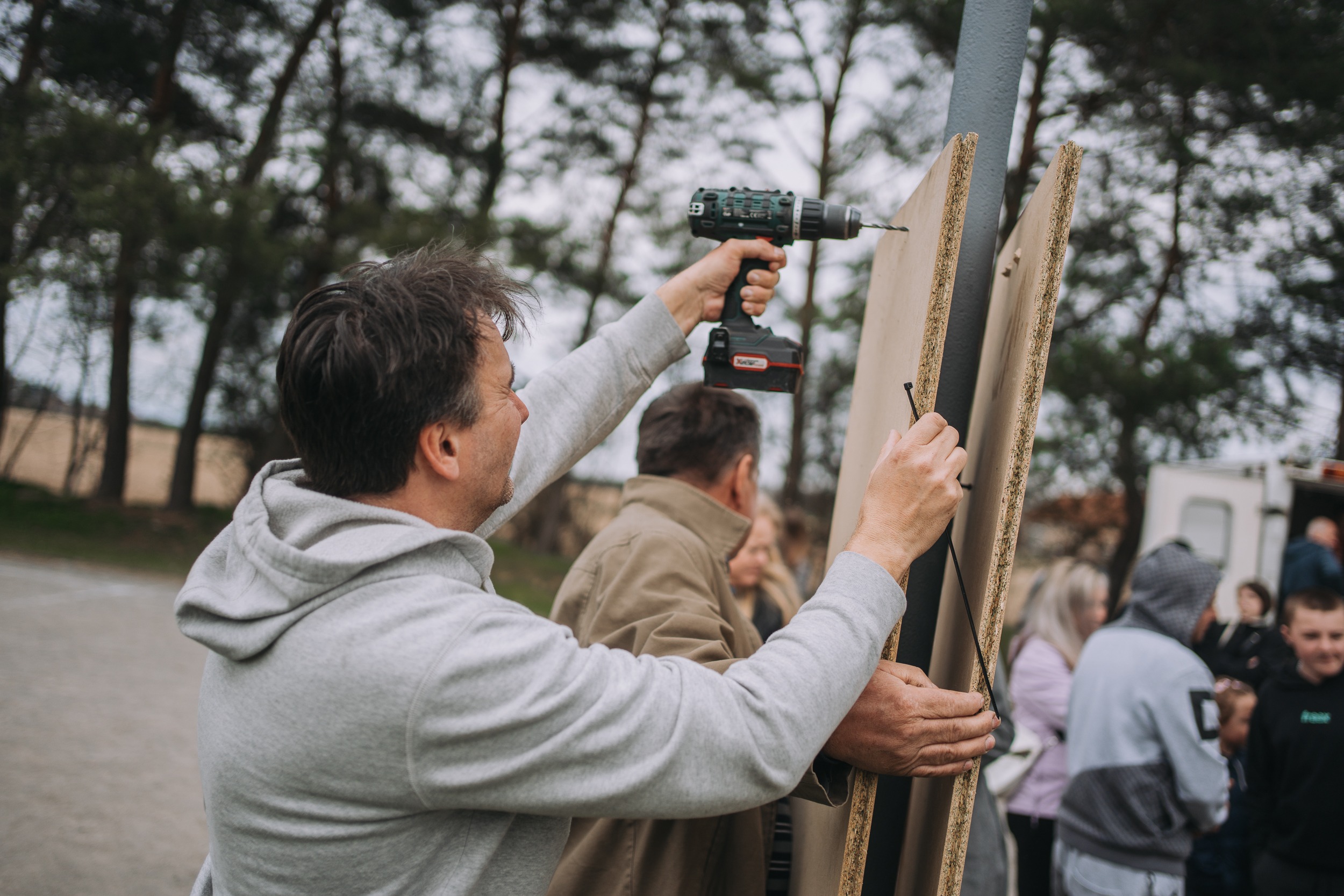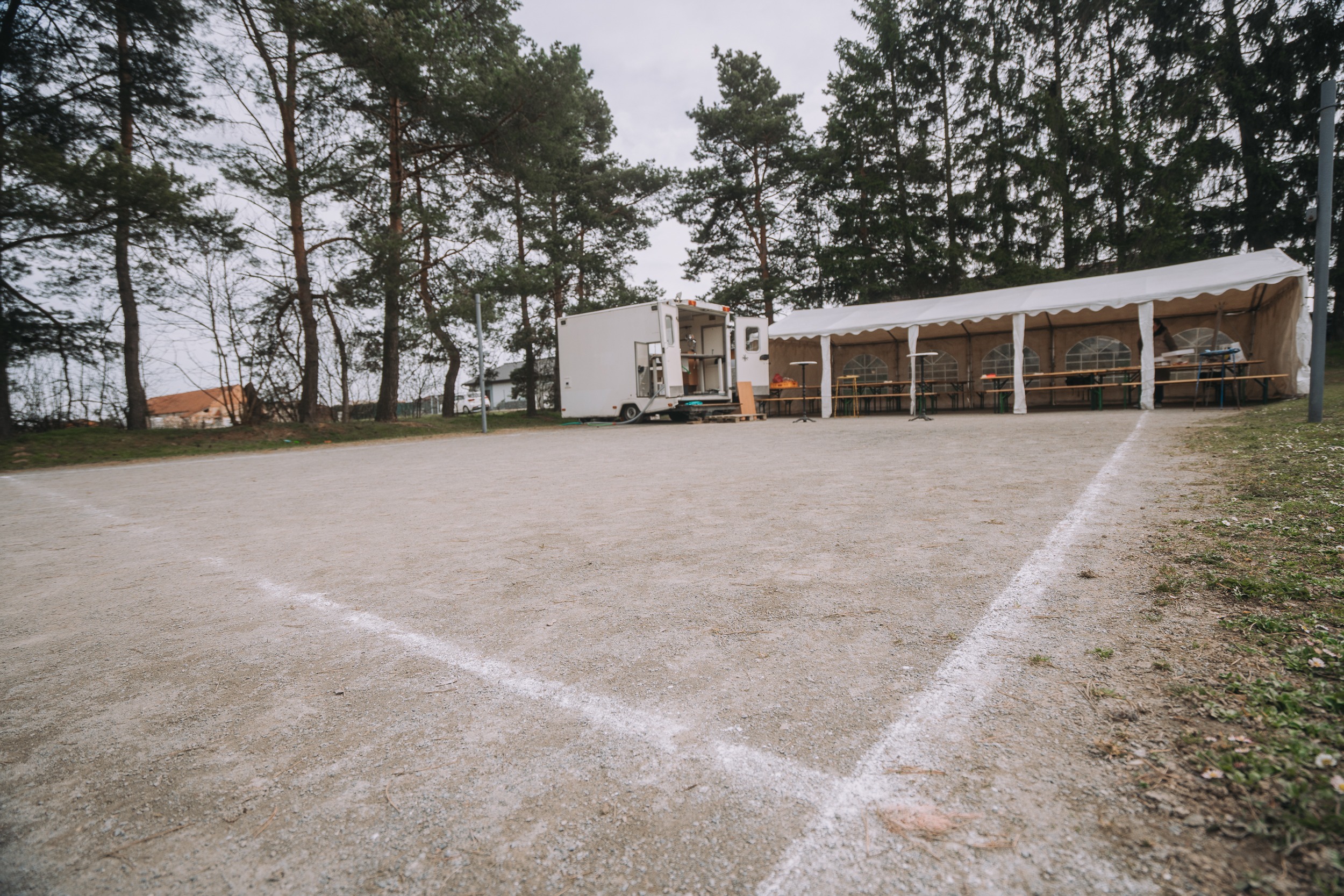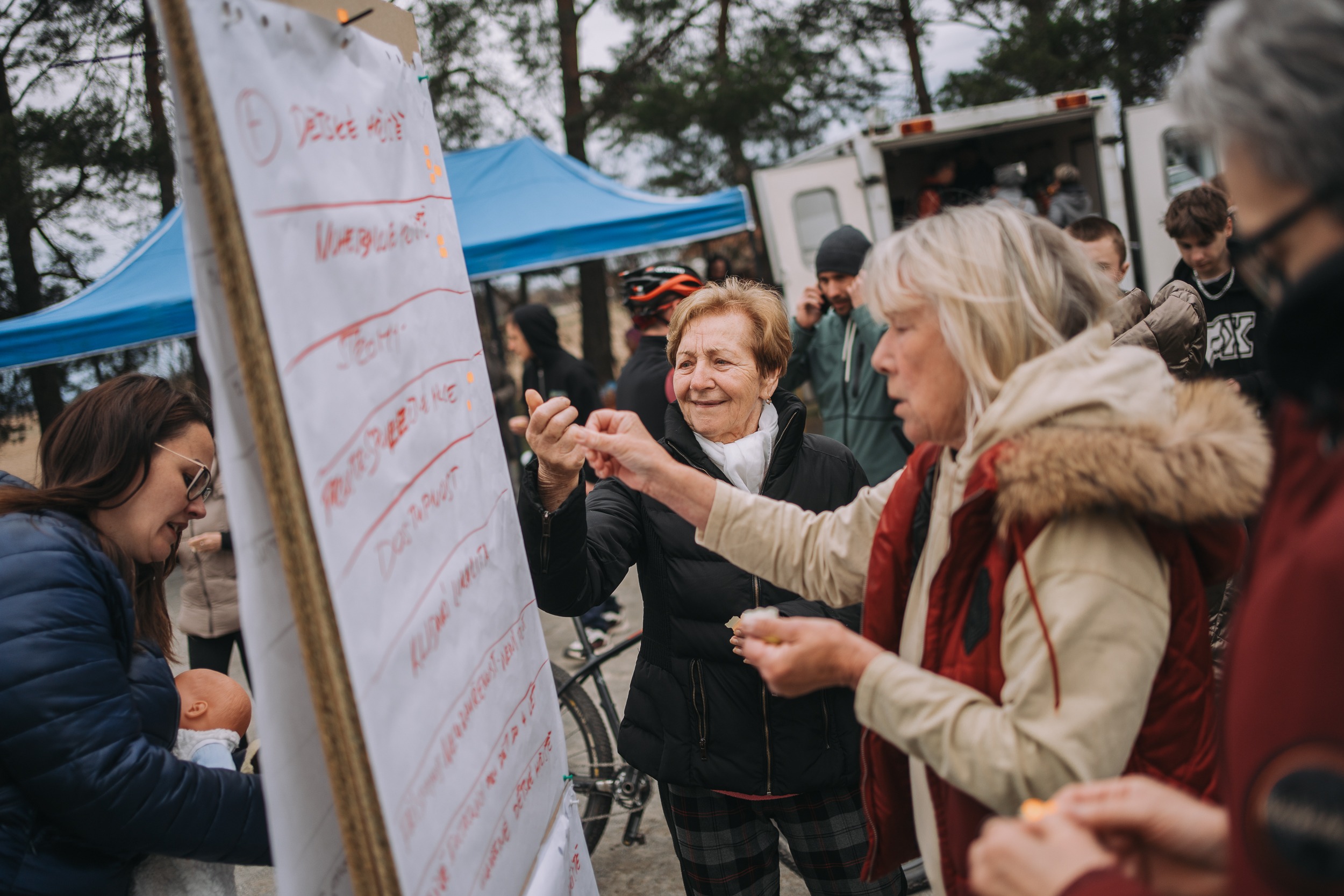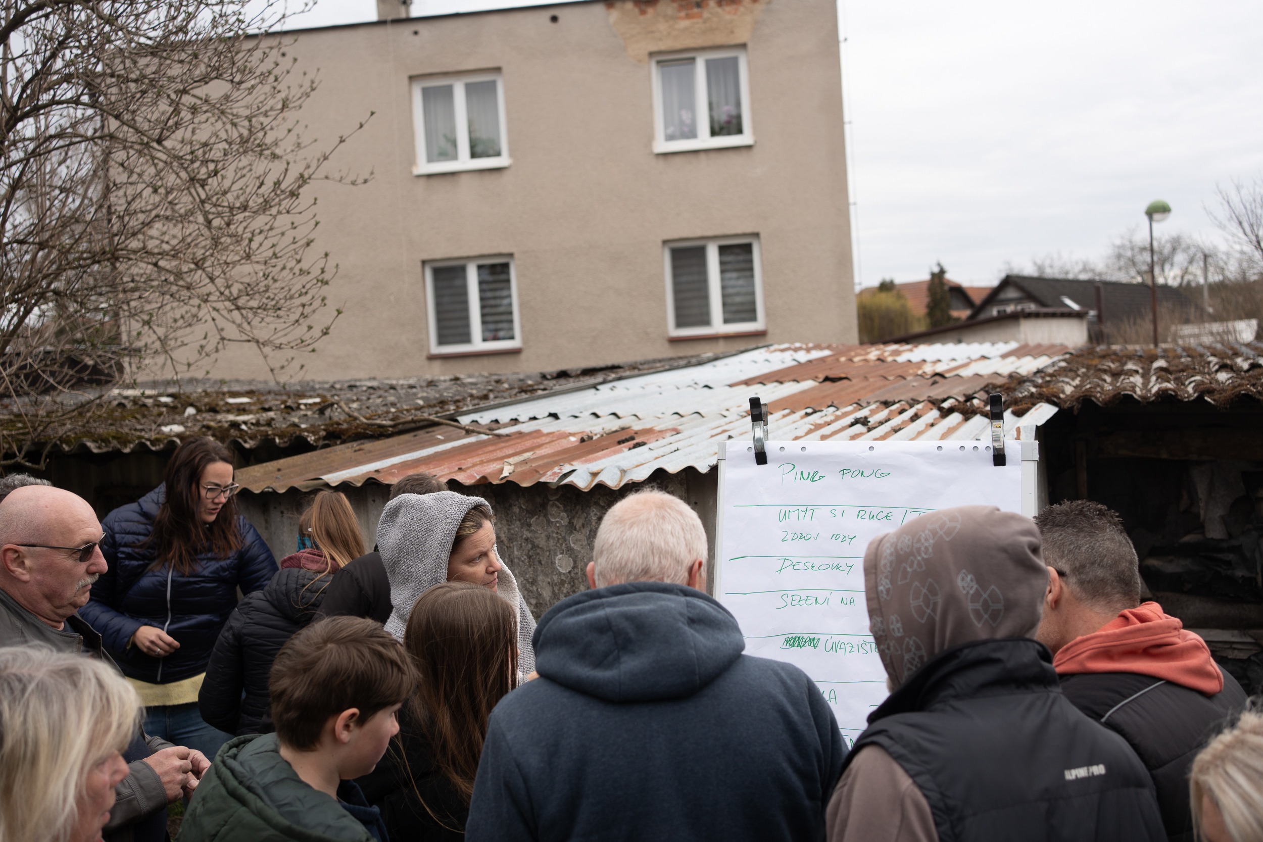 „Dá si ještě někdo párek?“ ozve se z bílého karavanu stojícím na okraji hřiště. Čepuje se pivo, lidé si ale berou spíš čaj nebo grog, protože jaro ukazuje svou studenější tvář. V bílém párty stanu jsou připravené lavice, na které se postupně usazují místní. Dorazí jich asi padesát, od dětí v kočárku po seniory. Společně budou rozhodovat, jak by šel celý prostor hřiště vylepšit.