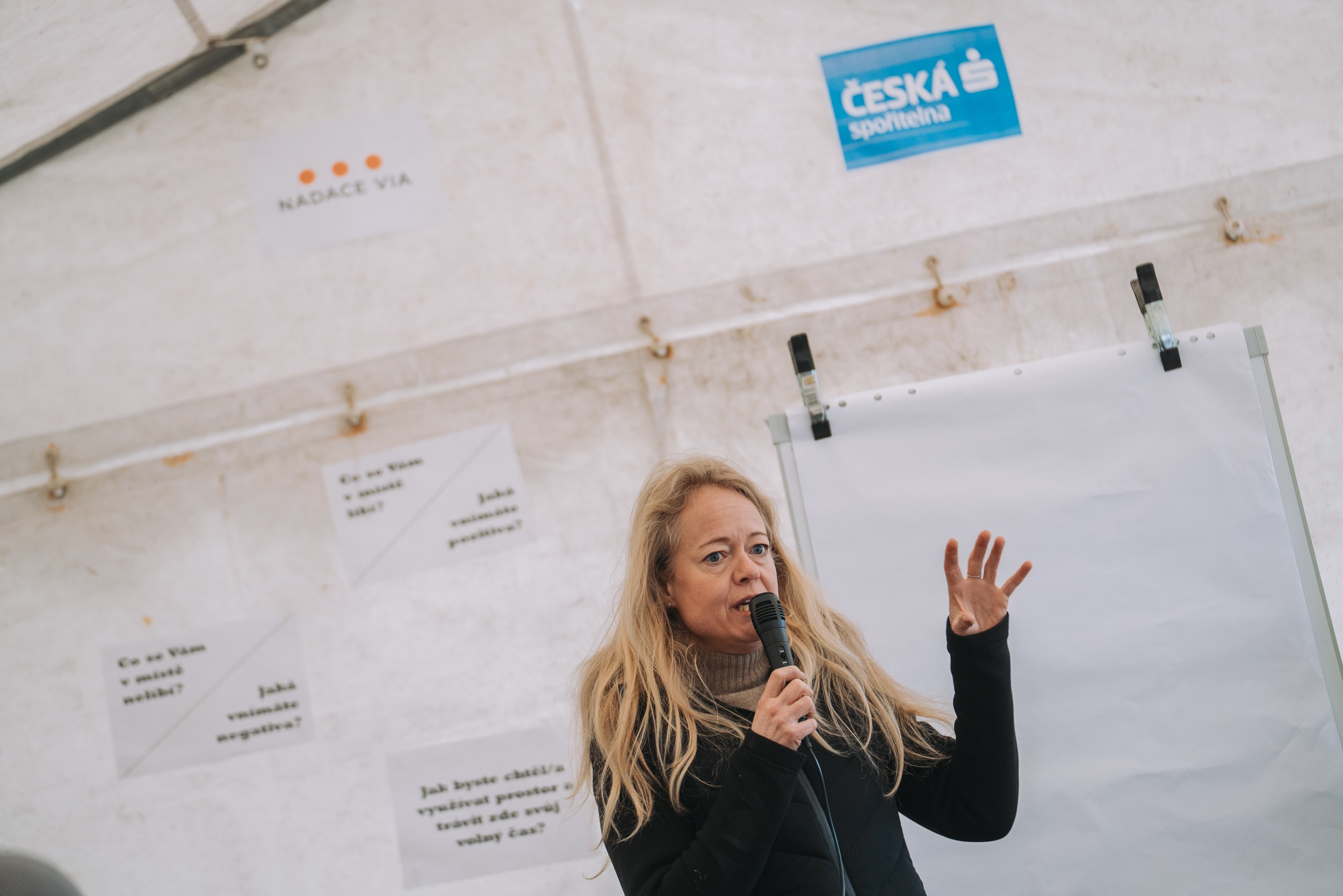 V bílém stanu už se mezitím začíná debatovat. Lucie Černická z Nadace Via všem vysvětluje, že nejprve mají zmínit pozitiva místa, které chtějí proměnit. „Dětské hřiště“, řeknou rodiče s kočárkem. „Nohejbalové hřiště,“ vykřikne se smíchem parta mužů s pivem. Další oceňují klidnou lokalitu a dostupnost. Černický vše píše na velký papír a pak přichází na řadu vyjmenování negativ. Lidem se nelíbí hlavně nevzhledné garáže u hřiště, které nejsou nijak opticky oddělené a kritizují také rozpadlé lavičky. Když je všechno zapsáno, přichází na řadu návrhy aktivit, které by se na místě mohly odehrávat. Zapisuje se vše od workoutu po ping-pong, největší debaty ale vyvolává spojení nohejbalového a dětského hřiště.