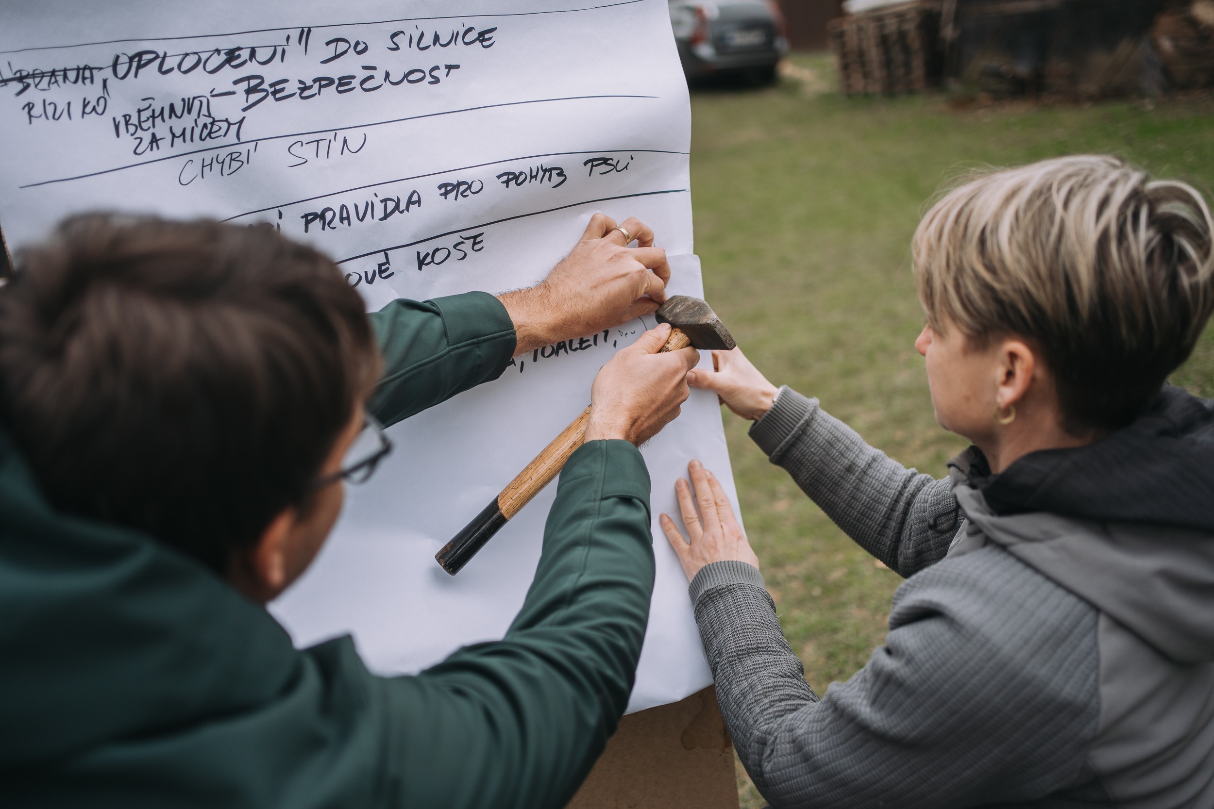 „Nohejbalové hřiště je rozpínané v tom smyslu, že má základní herní plochu a pak rozšířenou zónu, kam lítá míč. A ten lítá třeba do dětského hřiště,“ říká architekt Jan Sucr, který bude mít společně s kolegyní Karolínou Holíkovou na starosti architektonický návrh proměny celého místa. „Je to malý prostor, ale když se najde správný poměr, tak by to mohlo fungovat,“ dodává. Místní zatím pomocí nálepek hlasují pro největší pozitivum i negativum místa a také aktivity, které by na něm rádi viděli. Oba architekti si všechno poznamenají a během léta přijdou s návrhem, který si po schválení budou místní svépomocí realizovat. Třeba se už příští rok odehraje další nohejbalový zápas na úplně novém hřišti.
